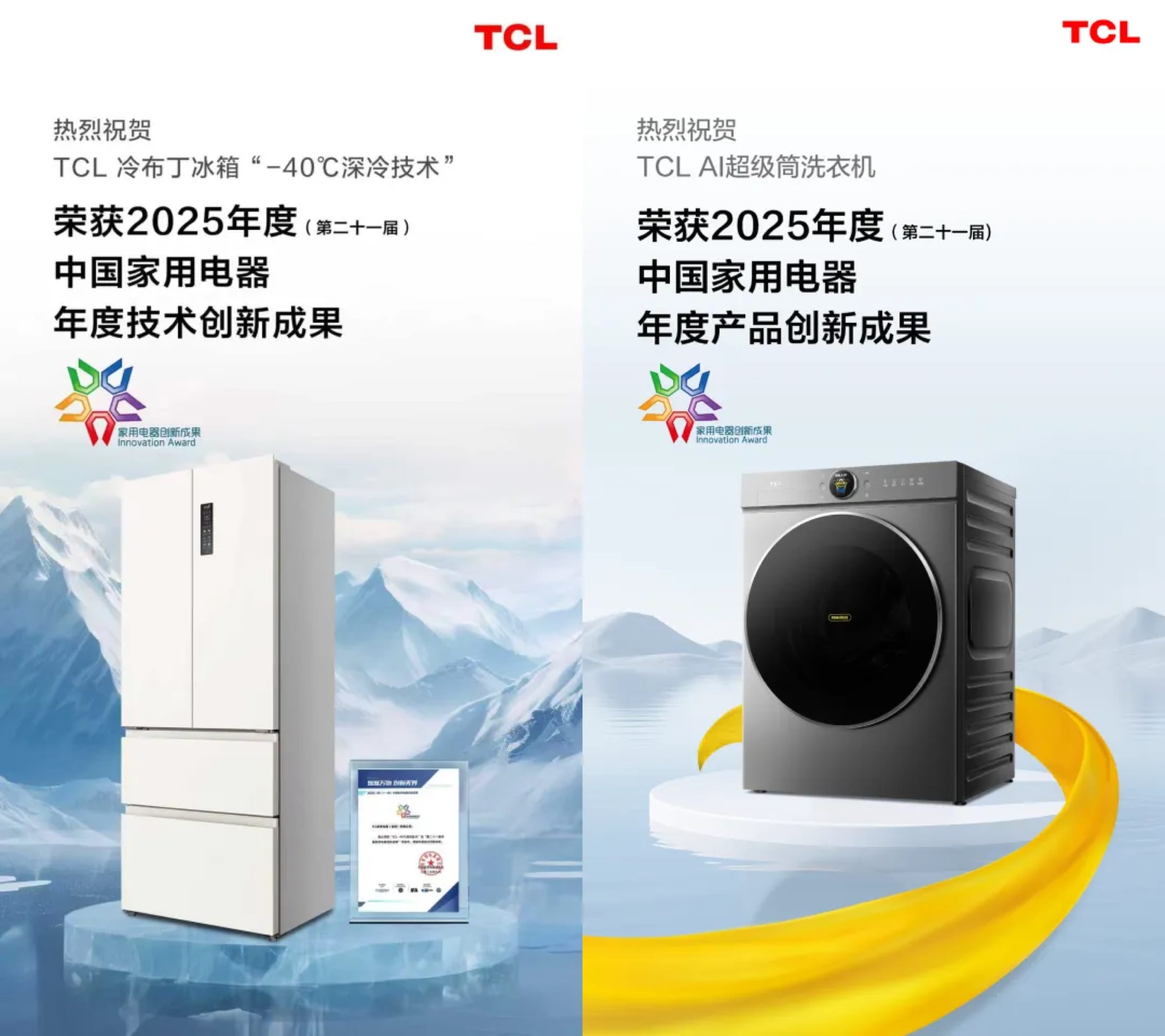 近日,第21届“中国家用电器创新成果”评选在德国柏林IFA 2025隆重揭晓。经过行业顶尖专家的严格评审,TCL AI超级筒洗衣机与TCL冷布丁冰箱从众多参赛产品中脱颖而出,双双荣获 “年度技术/产品创新成果奖”大奖!这不仅是一次产品的胜利,更是TCL坚持“科技领先”战略,以用户为中心进行创新突破的集中体现,向世界展示了“中国智造”的硬核实力。